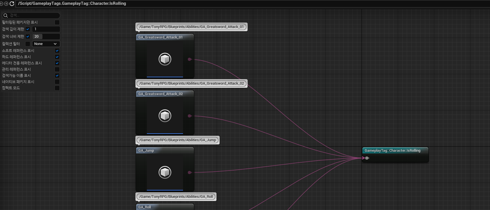Search for References를 사용하면, Reference Viewer와 비슷한 형태의 그래프 에디터가 나타나며, 그 안에서 해당 GameplayTag를 사용하고 있는 Asset 목록을 확인할 수 있습니다.